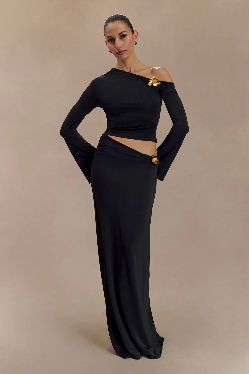 Komplet Aurelia emanuje klasą i pewnością siebie. Asymetryczny top na jedno ramię z rozszerzanymi rękawami nadaje wyjątkowy, stylowy charakter, a długa spódnica pięknie podkreśla sylwetkę. Subtelne detale i dopasowany krój sprawiają, że ten komplet jest idealny na specjalne okazje, podczas których chcesz wyróżniać się elegancją.