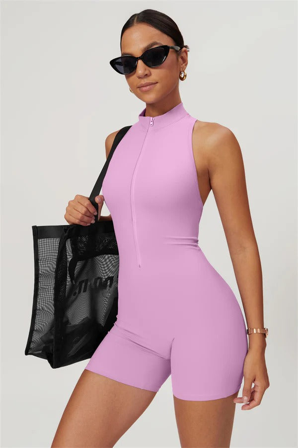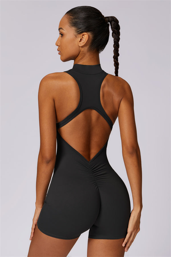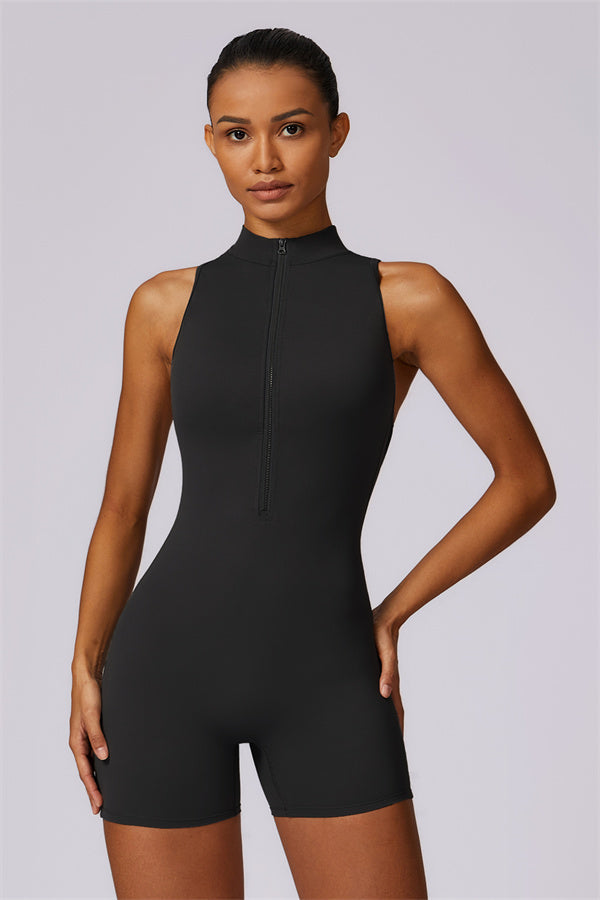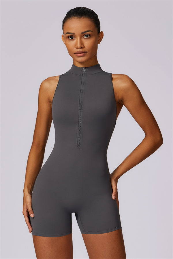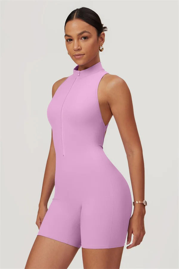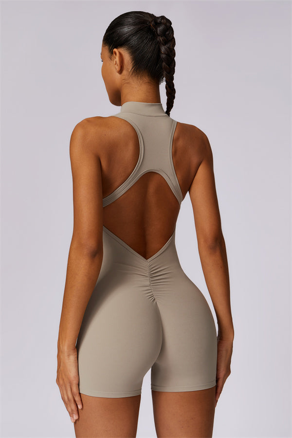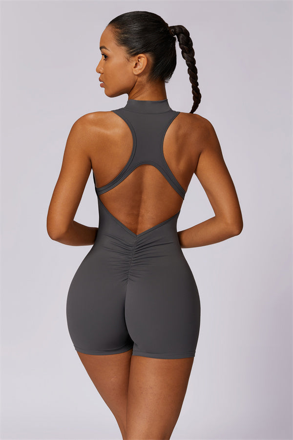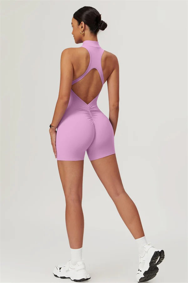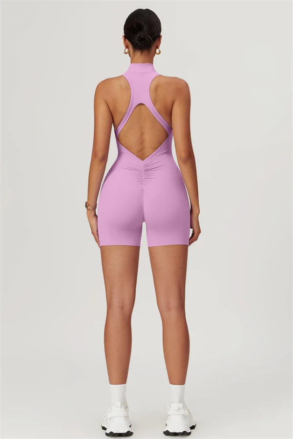Ten bezrękawnikowy kombinezon z odkrytymi plecami łączy styl z wygodą sportową. Wykonany z bezszwowej tkaniny typu nude-feel, która otula ciało niczym druga skóra, zapewniając dopasowany krój elegancko podkreślający sylwetkę. Zamek błyskawiczny z przodu gwarantuje nie tylko wygodę, ale także dodatkową wentylację podczas ruchu.