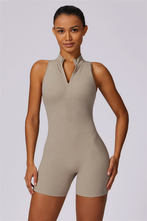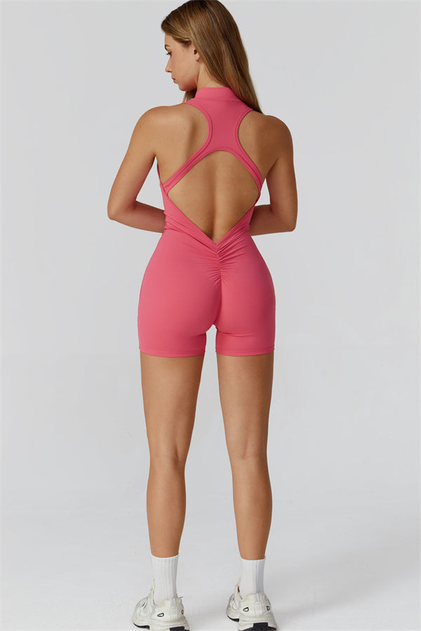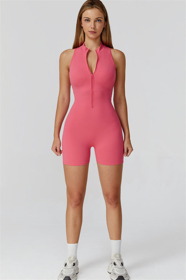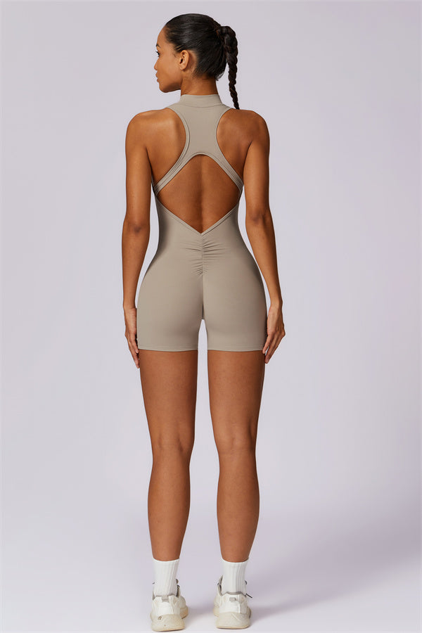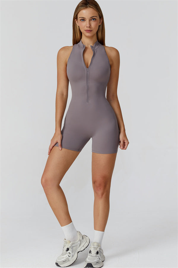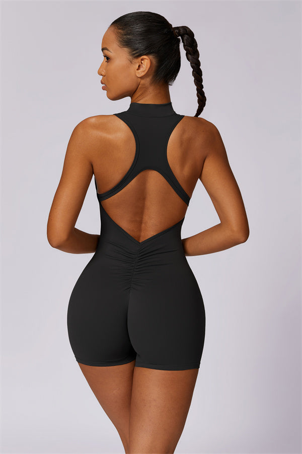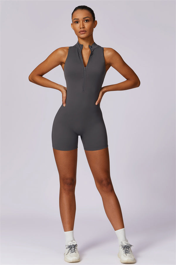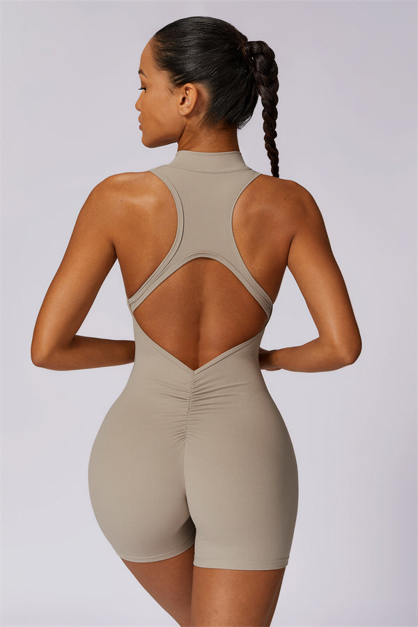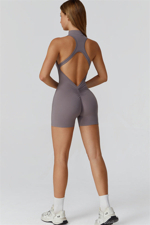 Ten bezrękawnikowy kombinezon z odkrytymi plecami łączy styl z wygodą sportową. Wykonany z bezszwowej tkaniny typu nude-feel, która otula ciało niczym druga skóra, zapewniając dopasowany krój elegancko podkreślający sylwetkę. Zamek błyskawiczny z przodu gwarantuje nie tylko wygodę, ale także dodatkową wentylację podczas ruchu.